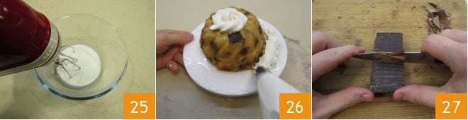 Entonces montad la nata agregando el azúcar glas mientras batís con las varillas eléctricas 25, cuando esté espumosa, colocadla en una manga pastelera y decorad comenzando desde el centro para luego pasar a los lados haciendo copetes alrededor de la base 26. Obtened virutas arrastrando una hoja lisa sobre la barra de chocolate, inclinando ligeramente el cuchillo para raspar la superficie 27.