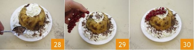 Verted las virutas obtenidas ayudándoos con una cuchara, evitando así que se derritan entre las manos 28 y esparcid sobre todos los copos de nata. Finalmente, colocad una ramita de grosellas para dar un toque de color 29 y vuestro bellísimo pudding de panettone está listo para ser servido 30.