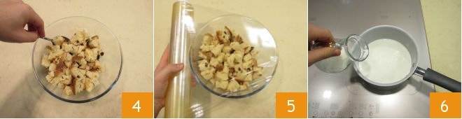 mezclad con una cuchara 4 y cubrid con film transparente dejándolo reposar de esta manera durante 15 minutos, los trozos se empaparán lo suficiente sin secarse al aire 5. Mientras tanto, pasad a la preparación de la Crema inglesa: en un cazo verted la leche, encended el fuego a temperatura media y dejad que llegue casi a ebullición, luego apagad y dejad templar durante unos minutos 6.