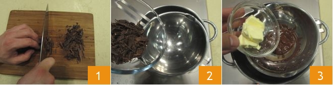 Para preparar el pudin con coulis de frambuesas, comienza picando el chocolate negro 1 y ponlo a derretir al baño maría (puedes usar un cuenco sobre una cacerola con agua hirviendo y el agua no debe tocar el fondo del cuenco) 2. Añade la mantequilla 3 y mezcla para que se derrita completamente la mezcla.