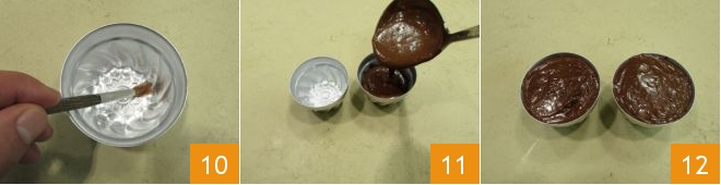 A continuación, toma los moldes (si utilizas los de aluminio, puedes engrasarlos ligeramente con aceite de almendras de sabor suave u otro aceite vegetal) 10. Vierte la mezcla en los moldes 11 hasta el borde 12 y deja enfriar durante al menos 3 horas, primero a temperatura ambiente y luego en el frigorífico.
