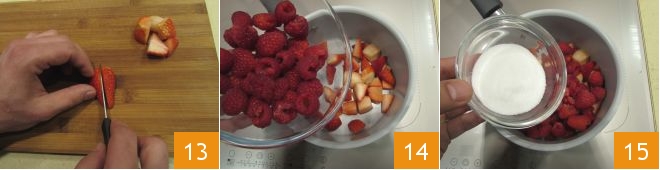 Pasa a preparar el coulis de frambuesas: lava las frambuesas y las fresas, retira las hojas verdes de estas últimas y córtalas groseramente 13, colócalas en una cacerola y añade también las frambuesas 14. Luego añade el azúcar 15 y cocina a fuego lento hasta que las fresas estén suaves.