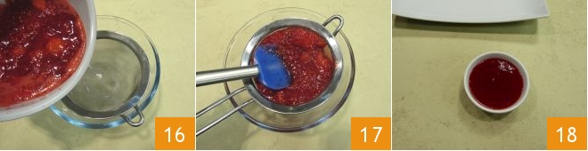Pasa la pulpa obtenida por el colador 16, ayudándote con una espátula suave 17 (es preferible no usar una batidora de inmersión porque al romperse las semillas de las fresas y las frambuesas podría resultar más ácida). Puedes dividir el coulis en pequeños recipientes para luego servirlo junto con cada pudin 18.