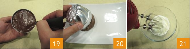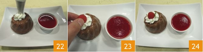 Cuando el pudin se haya solidificado, pasa la hoja de un cuchillo alrededor del borde para despegarlo más fácilmente del molde 19; voltea el pudin sobre un plato de servir 20. Luego monta la nata fresca con una batidora eléctrica 21 o en la batidora de pie y colócala en una manga pastelera. Decora el pudin con un copete de nata montada, decora con una frambuesa fresca y sirve con el coulis al lado: tu pudin con coulis de frambuesas está listo para ser servido.
