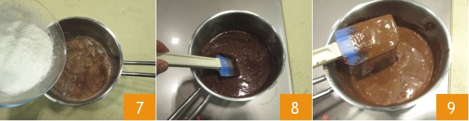 Y viértelo, siempre mezclando, en la mezcla de chocolate y leche 7. Vuelve a poner la cacerola al fuego y continúa mezclando hasta que la crema se haya espesado ligeramente y cubra la espátula (8-9).