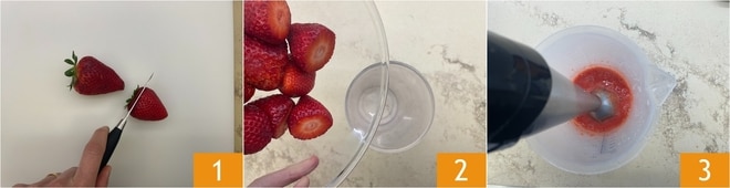 Para preparar el pudin de fresas, lo primero que hay que hacer es lavarlas y secarlas bien. Cortar la parte superior con las hojas usando un cuchillo pequeño 1 y transferirlas a un recipiente alto y estrecho 2. Triturar con una batidora de mano hasta obtener un puré 3.