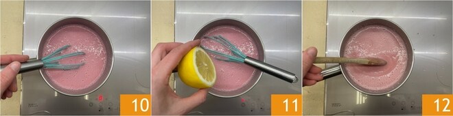 Mezclar bien para evitar grumos 10 y encender el fuego. Añadir también el zumo de medio limón 11. Cocinar a fuego medio, removiendo a menudo, hasta que empiece a hervir y espesar 12.