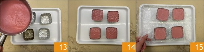 Humedece con agua 4 moldes grandes de 7x7 cm y 4 cm de alto. Verter el compuesto en el interior 13 hasta el borde 14. Cubrir con film plástico y dejar solidificar en el frigorífico durante al menos 2 horas.