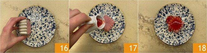 Desmoldar los pudines en un platillo 16, para facilitarte la tarea puedes mojar el fondo del molde con agua caliente. Decorar con la salsa de fresas reservada 17 y servirlo 18.