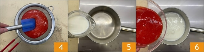 Colar el compuesto obtenido para eliminar las semillas 4. En un cazo verter la leche 5 y 300 g de puré de fresas 6, reservar el resto del puré en la nevera bien tapado, servirá para la decoración final.