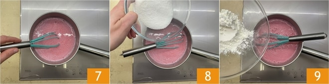 Mezclar con un batidor 7, luego añadir también el azúcar 8 y el almidón 9.