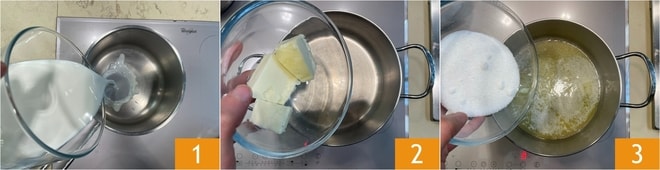 Para preparar el pudin de chocolate y nuez moscada con coulis de manzana, lo primero que debéis hacer es calentar la leche en un cazo 1. Mientras tanto, en una cacerola más grande, verted la mantequilla 2 y dejadla derretir a fuego lento. Añadid el azúcar apenas se haya derretido completamente 3.