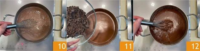 Tan pronto como obtengáis una mezcla homogénea, subid el fuego y dejad cocinar durante 5 minutos 10. Añadid el chocolate 11 y cocinad hasta que se haya derretido completamente 12.