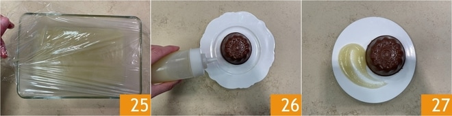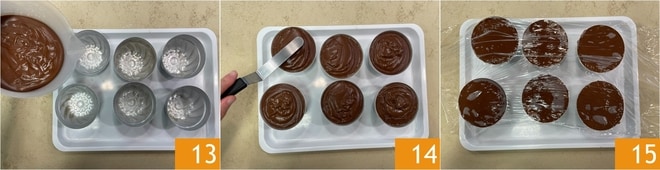 Verted la mezcla en 6 moldes de pudin (diámetro 8 cm y altura 5 cm). Nivelad la superficie 14, cubrid con film plástico 15 y dejad enfriar primero a temperatura ambiente y luego en la nevera durante al menos 2-3 horas.
