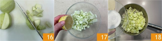 Mientras tanto, preparad el coulis de manzanas: peladlas y cortadlas en trozos de 1 cm 16. Transferidlas a un bol y aliñadlas con el jugo de un limón 17. Luego, vertedlas en un cazo con el azúcar y dejad cocinar a fuego medio-alto hasta que comiencen a caramelizar.