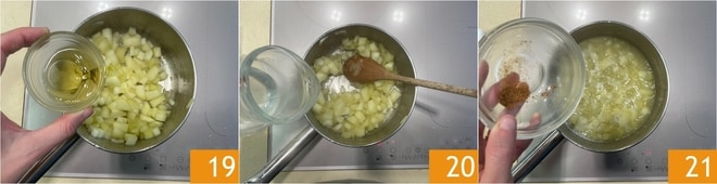 Desglasad con el ron 19, dejadlo evaporar y añadid el agua 20. Luego, verted también la nuez moscada 21.