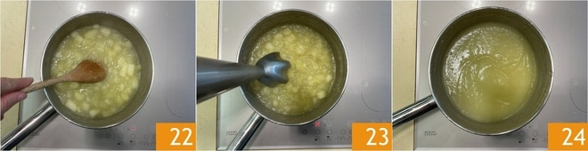 Cocinad unos minutos más hasta que el agua se haya evaporado 22; las manzanas deben quedar blandas, luego triturad la mezcla con una batidora de inmersión hasta obtener una crema lisa 24.