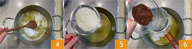 Mezclad bien 4 y añadid la harina tamizada 5 y el cacao, también tamizado 6.