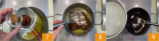Incorporad también la nuez moscada 7 y mezclad bien con una varilla 8 para evitar la formación de grumos. Ahora, verted la leche caliente poco a poco 9.