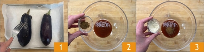 Para realizar el pulled aubergine, primero coloca las berenjenas enteras en una bandeja forrada con papel de horno, pínchalas con un tenedor 1 y cocínalas en horno estático precalentado a 250° durante 35-40 minutos. Mientras tanto, prepara la salsa: vierte la salsa barbacoa en un bol, luego añade el comino 2 y el ajo en polvo 3.