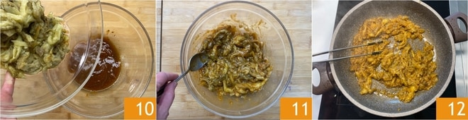 Añade las berenjenas desmenuzadas a la salsa 10 y mezcla bien 11. Transfiere las berenjenas condimentadas a una sartén antiadherente y saltéalas a fuego alto durante unos 8 minutos, distribuyéndolas uniformemente con unas pinzas de cocina 12: deben quedar bien glaseadas y doradas.