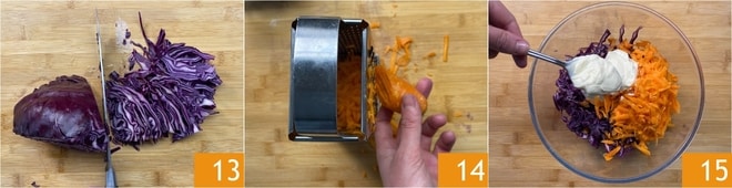 Por último, prepara la ensalada de col: corta en juliana con una mandolina la col roja 13 y las zanahorias 14. Une las verduras en un bol, condimenta con la mayonesa 15 y mezcla todo.