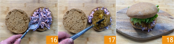 Estás listo para montar los bocadillos: rellena la base con la ensalada de col 16, luego cubre con las berenjenas desmenuzadas aún calientes 17 y una hoja de lechuga 18. ¡Estás listo para disfrutar del pulled aubergine 18!