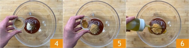 Añade también el jengibre en polvo 4 y la pimienta de cayena 5, sal, pimienta y aceite 6.