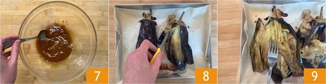 Mezcla para amalgamar el compuesto 7. Cuando las berenjenas estén cocidas, sácalas del horno y retira la piel con la ayuda de un cuchillo 8. Desmenuza la pulpa de las berenjenas utilizando un tenedor 9.