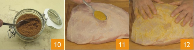 Mezcla bien todas las especias para obtener una mezcla homogénea 10; si es necesario, puedes pasarla también por un tamiz. Ahora toma el hombro de cerdo, añade la mostaza 11 y úntala con las manos por toda la superficie, tanto superior como inferior, para crear una capa fina 12.