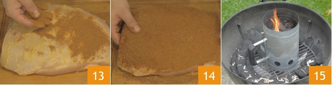Luego cubre la carne con el rub 13, asegurándote de cubrirla completamente 14. Mientras tanto, enciende la barbacoa y configúrala para una cocción indirecta 15.