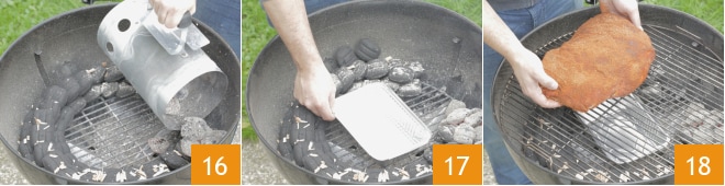 Coloca el carbón en una mitad de la barbacoa 16 y coloca en la otra mitad una bandeja de aluminio que servirá para recoger los jugos de la carne 17, luego coloca el hombro de cerdo sobre la parrilla en la zona sin calor directo 18.