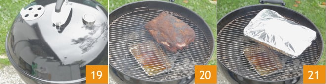 Configura las aberturas de aire de manera que obtengas una temperatura de la cámara alrededor de los 150° y procede con el ahumado 19. Cocina con la tapa durante al menos un par de horas o hasta que el rub haya formado una costra, el llamado bark 20. En este punto, transfiere la carne a una bandeja de aluminio y envuelve todo en papel de aluminio. Coloca la bandeja en la barbacoa 21 y continúa la cocción durante otras 6-8 horas, asegurándote de que la temperatura de la cámara se mantenga entre los 130°-150°. Puedes verificar que la carne esté cocida midiendo la temperatura interna, que deberá alcanzar los 97°-98°.