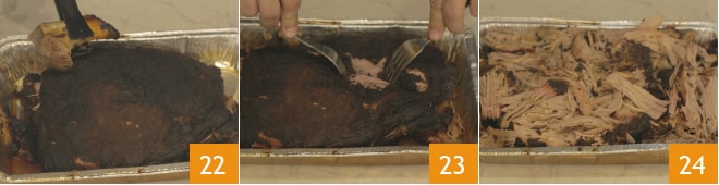 Una vez transcurrido el tiempo de cocción, escurre el líquido de cocción que se haya formado en la bandeja y elimina los huesos con un par de pinzas de cocina 22, luego deshilacha la carne utilizando simplemente 2 tenedores 23, dejando también algún trozo entero 24.