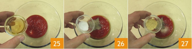 Prepara la salsa: vierte el ketchup en un bol junto con el vinagre de manzana 25, pimienta, sal 26 y jengibre en polvo 27.