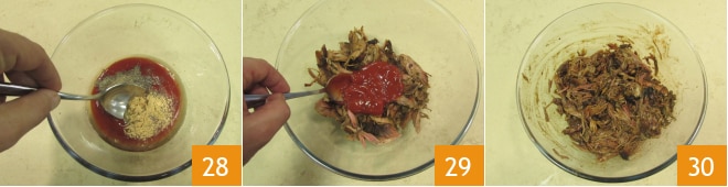 Mezcla bien 28 y añade la salsa obtenida a la carne deshilachada 29. Mezcla para incorporar el aderezo de manera uniforme 30.