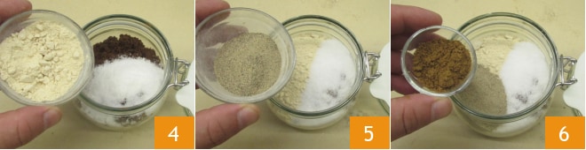 Añade también el ajo en polvo 4, la pimienta blanca 5 y el cilantro en polvo 6.