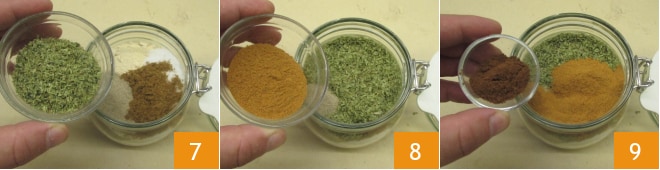 Finalmente añade el orégano seco 7, la pimienta de cayena 8 y el anís en polvo 9.