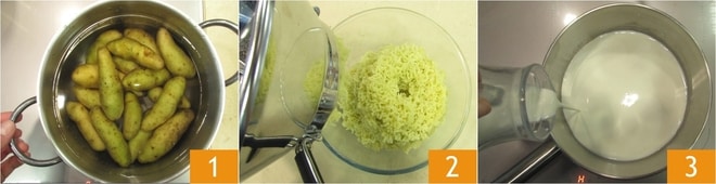 Para preparar la crema de patatas, primero hervid las patatas: colocadlas en una olla con agua fría, llevad a ebullición y cocinad durante unos 30 minutos, dependiendo del tamaño 1. Una vez cocidas, peladlas y luego pasadlas inmediatamente por un pasapurés mientras estén aún calientes 2. Mientras tanto, combinad la leche y la nata en un cazo 3 y llevad a punto de ebullición.