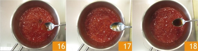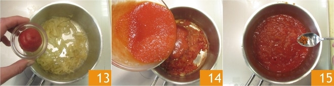Agregad también el concentrado de tomate 13, el puré de tomate 14 y una pizca de chile 15.