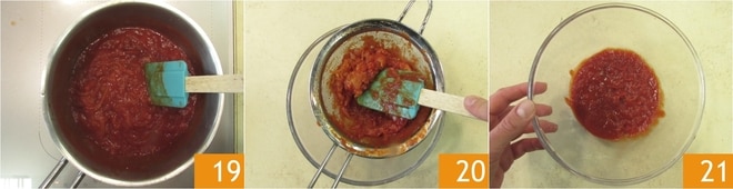 Mezclad y cocinad la salsa unos minutos más 19, luego coladla para eliminar la cebolla 20 y reservadla en un bol 21.