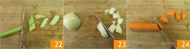 Para preparar el pulpo, primero limpiad y cortad en trozos gruesos el apio 22, la cebolla 23 y la zanahoria 24.