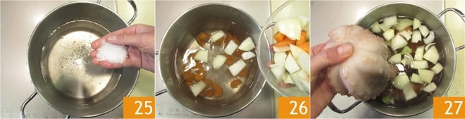 Llenad una olla grande con agua, luego añadid un puñado de sal gruesa 25, pimienta blanca en grano y las verduras 26. Sumergid el pulpo 27 y cocinad durante 55 minutos desde que el agua empiece a hervir.