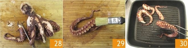 Una vez cocido, colocad el pulpo sobre una tabla de cortar y separad los tentáculos del resto del cuerpo 28. Pincelad los tentáculos con aceite 29, luego colocadlos en una plancha caliente para hacerlos crujientes externamente 30.