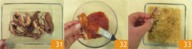 Cuando los tentáculos estén listos 31, podéis ensamblar los ingredientes: cortad los tentáculos por la mitad y pincelad los lados y la parte inferior con la salsa barbacoa 32, luego cubrid con el panko 33 que habréis tostado previamente en mantequilla y dejado secar sobre un paño.