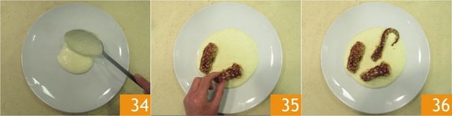 Distribuid la crema de patatas en el plato ayudándoos con el reverso de una cuchara 34 y colocad encima los tentáculos empanados 35. ¡Vuestro pulpo a la plancha sobre crema de patatas está listo para ser servido 36!