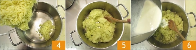 Verted las patatas trituradas en una sartén 4 y dejad que se sequen a fuego moderado, removiendo con una cuchara de madera 5. Cuando la mezcla de leche y nata esté bien caliente, añadidla gradualmente a la sartén mientras removéis para amalgamar 6.