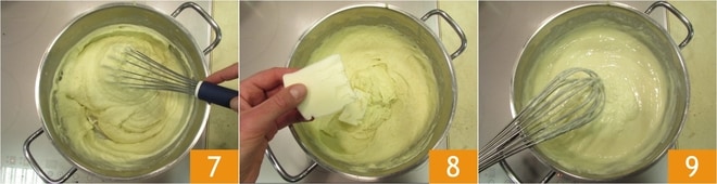 Continuad removiendo con una varilla manual 7, luego apagad el fuego y añadid la mantequilla fría de la nevera 8. Mezclad bien para incorporarla de manera uniforme 9. Finalmente, salpimentad y pasad la crema obtenida por un colador para que quede lisa y aterciopelada.