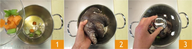 Para realizar el pulpo a la plancha con su mayonesa, necesitaréis un pulpo ya limpio y eviscerado. En una cacerola grande, verted las verduras cortadas en trozos grandes: apio, zanahoria y cebolla 1. Añadid también el pulpo ya eviscerado 2, cubrid con una tapa y dejad cocinar a fuego lento durante 60 minutos 3.