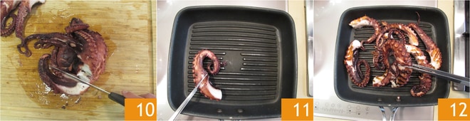 Calentad la plancha, luego retomad el pulpo ya enfriado, cortad los tentáculos 10 y colocadlos sobre la plancha caliente 11, cocinad durante unos 10 minutos y grillad bien. Luego apartad 12.